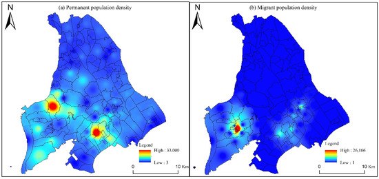 Spatial layout of permanent population density and migrant population density in Doumen District of Zhuhai (Guangdong Province), China, 2020. (a) Permanent population density. (b) Migrant population density.