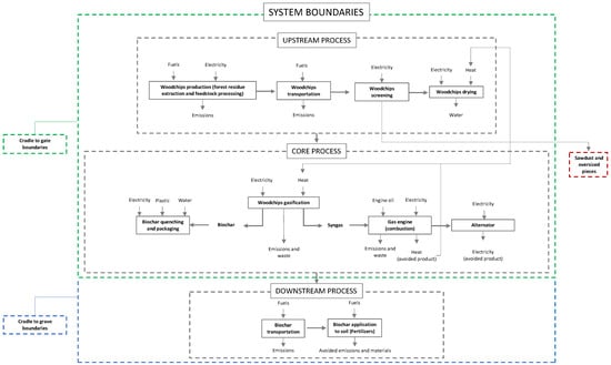 Starting from the functional unit of the LCA, the total amount of biomass necessary to produce 1 ton of biochar was reconstructed, considering all the inputs and outputs in the processes preceding gasification. The descriptive processes of biomass production were selected from the OpenLCA free databases, choosing those considered to be the best approximations.