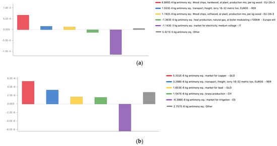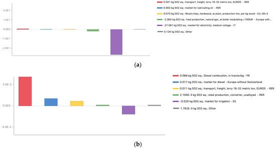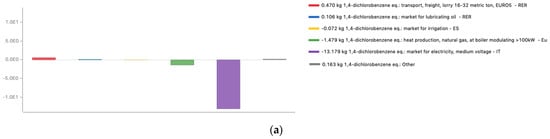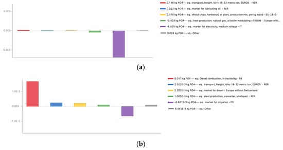 Emission data for the transport processes were taken from the OpenLCA database [63]. A EURO5 16–32 t lorry was selected from the database and regular gasoline was used as the standard fuel type. The unit used for the evaluation of transport flows was ton-kilometer (t×km), which was defined as the transport of one tonne of goods by a defined transport service over one kilometer [64]. When calculating the distances traveled by the trucks during the transfers, both the outward and return journeys were taken into account; this represents a highly conservative approximation, as the fact that the vehicle would travel unloaded during the return journey was not considered. Assessing the distance traveled by the suppliers’ trucks, the total number of journeys in which the woodchips were unloaded at the plant was considered. It was assumed that no biomass losses occured during transport, so the total amounts transported were the same as those indicated for gasification pre-processing.