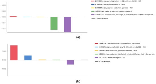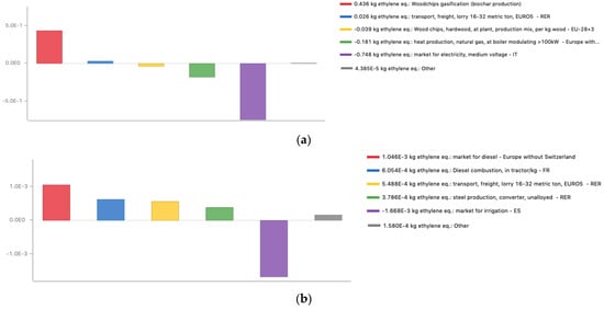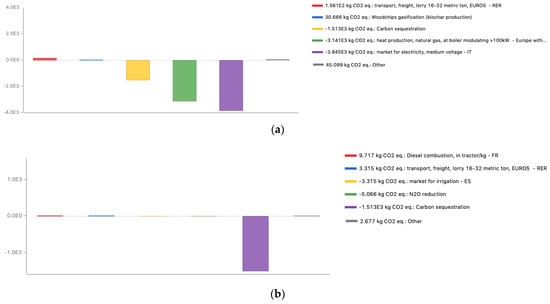 This company has expressed interest in exploring biochar and its ability to reduce atmospheric carbon, so it is important to show that LCA can produce a net effect on global warming without being compared to anything else. Gasification was found to be both the most efficient process for producing energy using the same raw material in comparison to pyrolysis [49], and to be much more sustainable than the complete combustion of biomass [55]. The hypothesis is that this LCA analysis could prove that the gasification chain can contribute to the reduction of greenhouse gas emissions in both the energy and agricultural sectors. The production of energy from biomass can replace the energy produced from fossil sources [56], and thus, gasification can reduce the demand for electricity in the national energy mix [57]. Furthermore, the use of biochar in agriculture can positively contribute to traditional agricultural practices—for example, by reducing the use of fertilizers and water for irrigation and GHG emissions from the soil [58].