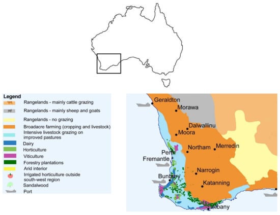 Figure 1. Land use in South-West of Australia. Source: Based on a DPIRD map available at: https://researchlbrary.agric.wa.gov.au/gis_maps/10/ (accessed on 12 November 2021).