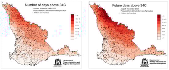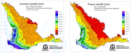Climatic changes projected for Australia which are relevant for agriculture include trends of rising temperatures, changing rainfall patterns, and more extreme weather events [,,,,]. For the south-west of Australia, both maximum and minimum temperatures are expected to rise, resulting in an average increase of between 0.6 °C and 1.5 °C by 2030. The intensity and incidence of severe weather events are also projected to increase over the coming decades. An increase in the number of dry days is also expected, which adds to the risk of wildfire.