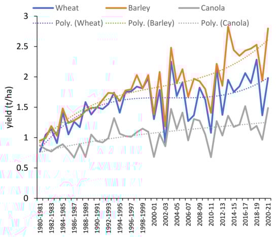Figure 4. Wheat, barley and canola yields in south-western Australia: 1980 to 2020.