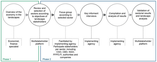 To support the work of ILIs, we developed a methodology to assess financial flows at the landscape level [13]. The Landscape Assessment of Financial Flows (LAFF) methodology was designed as a tool for multi-stakeholder partnerships to analyse the impacts of financial flows on agreed-upon landscape objectives. It can be used to supplement (and in preparation for) the Landscape Investment and Finance Tool (https://liftkit.info, accessed on 4 October 2021), which was designed to identify opportunities for specific business cases aligned with landscape objectives and direct them to appropriate sources of finance. The LAFF tool intends to improve stakeholders’ understanding of a landscape’s financial context. It helps with identifying system-wide challenges with respect to the landscape’s financial structure (e.g., key gaps in services) and opportunities to strengthen the coordination of investments in the landscape and can inform the development of policies supportive of investments in ILIs by local and provincial authorities. Implementing the tool will also help with identifying financial flows considered to be most relevant for further study because of their impacts on landscape objectives.