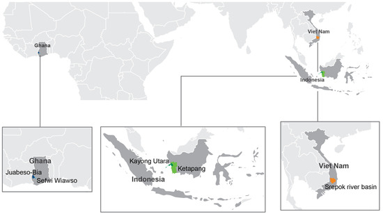Between November 2018 and July 2020, the methodology was piloted to discover which elements were most successful and which could be improved. The pilots took place in the Ketapang Kayong Utara (KKU) landscape in Indonesia, the Juabeso-Bia and Sefwi-Wiawso (JBSW) landscape in Ghana and the Srepok River Basin (SRB) in the Dak Lak province in the Central Highlands of Vietnam (Figure 2). The three landscapes have been undergoing rapid forest loss due to the expansion of agrocommodities (oil palm in KKU, cocoa in JBSW and coffee in SRB). In all landscapes, local stakeholders are organized in multi-stakeholder platforms and have agreed upon a set of common landscape objectives. All three implementing organizations are associated with Tropenbos International, which aims to increase the role of smallholder agroforestry and community forestry to achieve climate-smart landscapes [14,15,16]. Below, we summarize some of the main results of the pilots. The results of the full assessments have been documented in detailed reports [17,18,19] (provide background information on the cases used for this analysis, these are available at https://www.tropenbos.org/resources/publications/the+landscape+assessment+of+financial+flows+-+a+methodology, accessed on 4 October 2021).