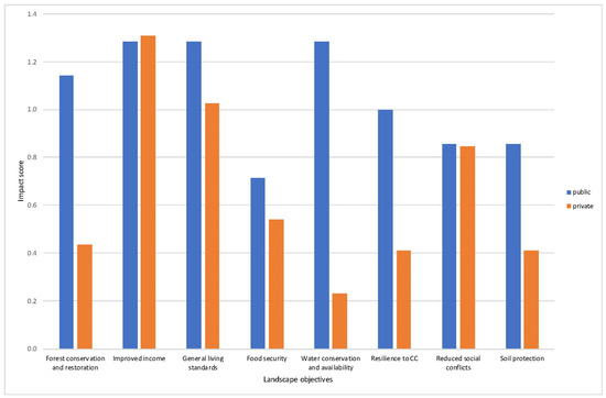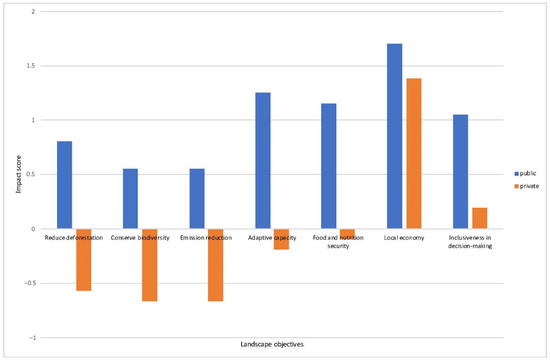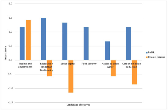 Perceived average impacts per land unit of public and private investments on landscape objectives in the JBSW landscape (based on Pamerneckyte et al., 2020 [17]).