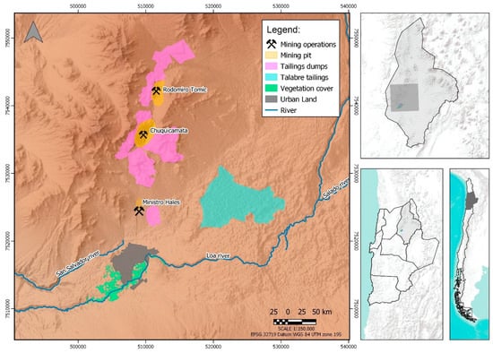 In terms of political administration, the area under study was part of Bolivia until the end of the War of the Pacific (1879–1884), before being annexed by the State of Chile. At present, the area lies within the municipality of Calama, in El Loa Province, within the Antofagasta Region. Since the early 20th century, large-scale copper mining has been conducted in the area surrounding the Calama oasis, which has driven major territorial transformations, as this article attests to throughout. Figure 1 shows the location of the present-day city of Calama and the vegetative cover at the oasis, as well as the city’s proximity to the main mining deposits, tailing ponds, and waste heaps.