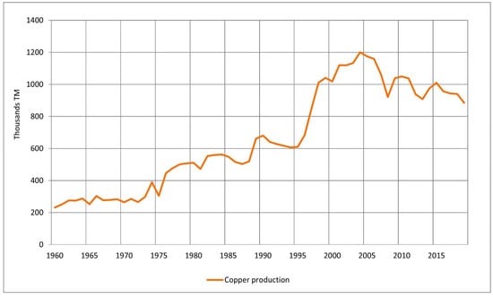 An important aspect for understanding the territorial processes associated with copper mining expansion over time is that, regardless of the political orientation of any given administration, in operational terms, management of the mines has focused on constantly increasing production [76,77,78]. While accelerations and slowdowns have occurred at different times in the evolution of copper production in the Loa River basin throughout the 1960–2019 period (Figure 3), the overall trend shows an increase in extractive capacity, most notably in the 1975–1990 and 1995–2005 cycles.