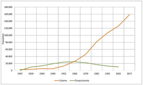 The camp’s population grew steadily from the beginning of mining operations at Chuquicamata until the mid-20th century (Figure 4), before the number of residents stabilized at around 24,000 in the 1952–1960 inter-census period. From then onwards, the population gradually decreased until the 2002 census. It should be noted that the camp was closed in 2007, and its population relocated to Calama, owing to the expansion of productive operations [81]. Meanwhile, the population of the city of Calama also rose with the opening of Chilex operations, but at a different pace than the camp. The city’s population increased slowly until the 1940s, at which time it began to rise much more sharply; it has continued to do so up to the present. The 2017 census reported 158,487 people living in the city.