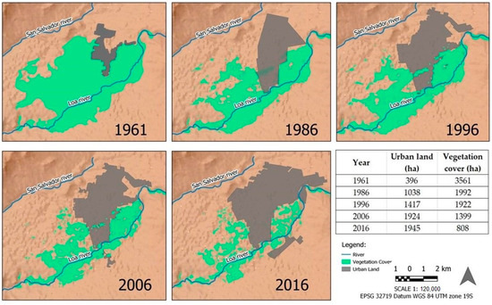Areas with vegetation cover steadily diminished as the city expanded. From 1961 to 2016, the urban footprint increased by 1549 ha, while vegetation cover fell by 2753 ha (Figure 6). This is because the city has directly encroached upon those areas and because of the abandonment of agricultural activities and the limited irrigation of the vegas.