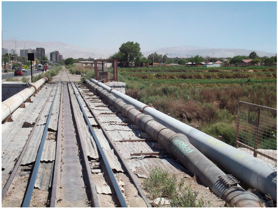Since the late 19th century, the demand for water from the Loa River has grown considerably with the expansion of the nitrate industry in the region, the building of the Antofagasta–Bolivia railway, and the growing demand for drinking water for mining camps and cities [48,100]. Water resource extraction and the privatization of water rights rose sharply from 1915 onward with the development of large-scale copper mining and the accompanying urban expansion; complex systems of intakes, pipes, and storage ponds were also built along the basin [47,48,49,50,101].