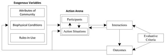 The IAD framework comprises exogenous variables, an action arena and evaluation results. The action arena contains two variables: the participants and the action situations. The participants are considered as a single individuals or a group that functions as a joint action. Participants have certain “resources” and different levels of “information”, and they choose the “decision-making process” of a certain action by “processing” such resources and information. Action situations refer to the structure that directly affects the behavior process of the research object, namely: a “participant” with a specific “status” may produce different types of “information” based on the “result” of the action, and complete its “action” through a certain “control” method. Within the action arena, participants interact according to the incentives they face. Given the exogenous variables that affect the structure of the action arena, the IAD framework helps confirm the action arena, the mode and the outcome of the interaction, as well as evaluating the outcome [62].
