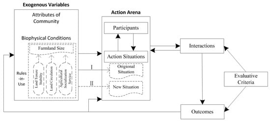 Farmland is the foundation of agricultural production. The scale of farmland is bound to affect all links of agricultural production. As an element of biophysical conditions, the scale of farmland is proven to have a close relationship with rural irrigation collective action. The gist of the IAD framework is that the decision making of participants is not only subject to biophysical conditions and attributes of community in the external environment, but also subject to rules-in-use (see Figure 2). At present, many rural collective irrigation facilities are falling into decline shortly after they are completed, which is due to the lack of effective institutional arrangements. Rules-in-use shape the action situation, thus further influencing the incentive structure and choice logic used by the actor. Generally, the preliminary system and rules of rural irrigation infrastructure projects are relatively complete, but the formulation and implementation of subsequent management and protection rules often fail to be guaranteed. This increases the transaction cost of management and protection, causing free-riding behavior by farming households, and discouraging farming households from participating in management and protection. Overall, the existing literature on rural irrigation collective action focuses more on the role of irrigation-related rules and systems, and less on the impact of other rules and systems. Therefore, it is necessary to delve into the relationship between relevant land systems and rural irrigation collective action in the context of farmland scale management, so as to discover the influence of different systems. This research is built upon the three aspects of farmland tenure stability, farmland tenure transfer, and socialized agricultural services, as well as systems concerning scaled-up operations of farmland.