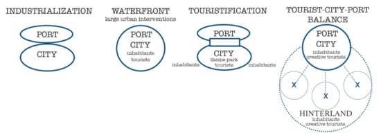 In the course of this evolution, the direction predominantly sought by port-city integration was to attract residents back to their port. To achieve this, different policies were employed, such as providing local and global uses, extending the urban transport network, and combining port and urban uses, so that the port could again be part of residents’ day-to-day life, as it was historically [54]. Today, in this fifth stage, the trend has changed direction again. Few residents accompany the numerous tourists’ daily flock along the waterfront heading towards the historic city center [53].