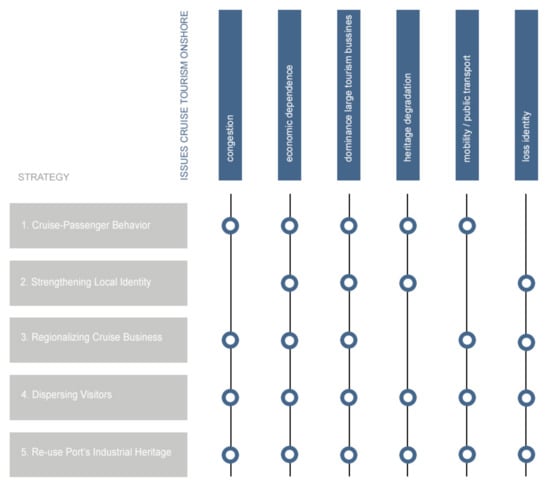 Distribution of specific issues of cruise tourism onshore according to strategies. Source: Authors.