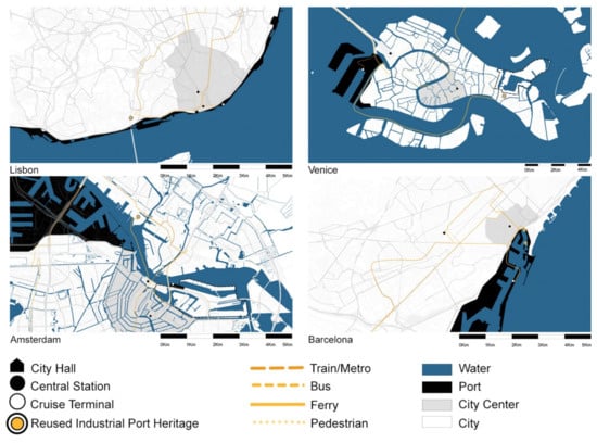 These interventions include not only the recovery of these buildings, many of which would have a long wait for any major urban regeneration interventions, but also the life between them, the public space. Life between buildings becomes richer, more stimulating, and more rewarding than any architect’s combination of ideas [123]. This values a port-city’s identity and makes it more human by means of particular low-budget, short-term actions, in the context of touristification. It is society itself that recovers these old buildings with alternative uses that adapt to new ways of living and working and coexist perfectly with tourist and port activity. They keep the essence of the city alive through the activities of its inhabitants, with a logic about reusing existing structures, to prevent ports from becoming non-places and their cities from becoming theme parks. Examples of these interventions (see Figure 3) are the LX-Factory, in Lisbon [100,106], the NDSM, in Amsterdam [104,105], and many others where local creative activity has become the focus of tourist attraction or even the Arsenal of Venice that hosts the Biennale [103]. However, if, to these actions the port activity is added, such as old harbor markets, with much of the building in disuse, which can be reactivated with fish markets, restaurants of local fresh products, such as the Sidney Fish Market, or soon, the Barcelona Fish Market, it is the tourism itself that resurrects and encourages traditional local activity [124]. One more time, the organization of public transport is very important to connect these buildings to the historic center, central station, cruise terminal, and so on (see Figure 3).