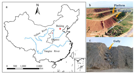 (a) Locations of the experimental soils; (b) The platform-slope system of spoil dump; (c) The gully developed on platform-slope system.