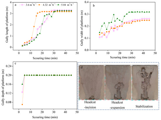 Gully development was triggered by the incision at the bend between the platform and the slope. The incision became larger in three dimensions, resulting in the morphological development of gullies. The final gully length, width, and depth were 3.18–3.30 m, 0.25–0.32 m and 0.2 m on the platform, respectively. The platform gully length (PL) experienced three development stages. PL first increased slowly below 0.8 m and then increased sharply from 0.8 m to 3.0 m, causing the runoff to bifurcate, and finally remained stable at 3.0 m (Figure 3a). The migration velocity of the headcut, on average, was 7.31–10.63, 16.59–43.74, and 0.57–1.76 cm min−1 in the three stages. The headcut migration length in the three stages accounted for 24.48–26.91%, 63.65–68.78% and 4.48–10.12%. No steady headcut migration was observed. The gully depth on the platform (PD) increased rapidly at the rate of 4 cm min−1 within 5 min and then remained stable (Figure 3b). The platform gully width (PW) experienced two stages (Figure 3c). In the first 28 min, PW showed an increase trend at the speed of 0.09–1.16 cm min−1, with fluctuation between 0.11 m and 0.30 m. In the following stable stage, PW no longer changed. PW significantly increased with the discharge (p < 0.01).