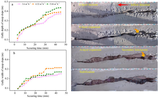 The development of gully depth on the steep slope (SD) was divided into four stages (Figure 4a). SD quickly increased within 0.2 m, which was equal to the thickness of A layers. The increasing speed was 2.27–2.89 cm min−1. Then, SD increased slowly at a speed of 0.36–0.51 cm min−1 after the gully beds reached the B-layer. After the flow began to concentrate in the B layer completely, SD increased rapidly again with a speed of 0.81–1.10 cm min−1. Finally, SD stabilized. The development of gully width of the steep slope (SW) was divided into three phases (Figure 4b). In the first phase, SW sharply increased at the speed of 1.17–1.33 cm min−1 within 0.2–0.22 m. Once the inflow incised in the B-layer successfully and concentrated on the new gully bed, the sidewall expansion slowed down. SW showed a slowly stepped growth caused by the gravitational collapse of the gully sidewall. The step height was between 1.64 and 3.29 cm. Finally, SW stabilized. No significant difference in SW was found between different inflow rates in the first phase (p > 0.05), but the differences did exist in the two latter stages (p < 0.01).