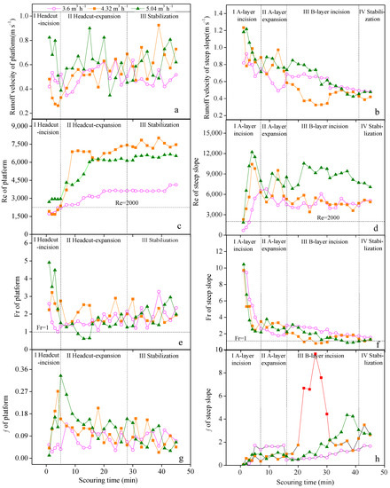 For open-channel hydraulics, the flow is laminar when Re < 500, turbulent when Re > 2000, and transitional when Re is between 500 and 2000. The change in platform Re was divided into three stages (Figure 5c). Re increased rapidly in the headcut-incision stage, indicating that the flow converted from transitional flow to turbulent flow. Then, Re had the greatest increase in the headcut-expansion stage. The values at the end of headcut-expansion were 1.63 to 2.84 times those of the headcut-incision stage. Finally, Re increased slowly in the stabilization stage. Turbulence flow remained the majority flow type. The Re of the steep slope increased sharply in the A-layer incision stage. Then, Re gradually decreased with fluctuation in the three latter stages (Figure 5d). The decrease process experienced a rising trend from 9 min to 22 min on 5.04 m3 h−1 inflow. Re varied from 702.5 to 12,221.9 in all the runs. The turbulence dominated the duration of the runs. Re < 2000 only occurred within the initial 3 min after runoff generated under conditions of 3.6 m3 h−1. The Re of the steep slope was 0.90–1.56 times that of the platform on each inflow rate, while no significant correlation between them was observed.