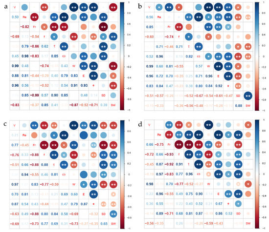 (a–d) represent the correlation matrices of hydraulics in the gully development processes of A-layer incision, A-layer expansion, B-layer incision, stabilization on the steep slope, respectively. V is flow velocity, ** represents p < 0.01, * represents p < 0.05.