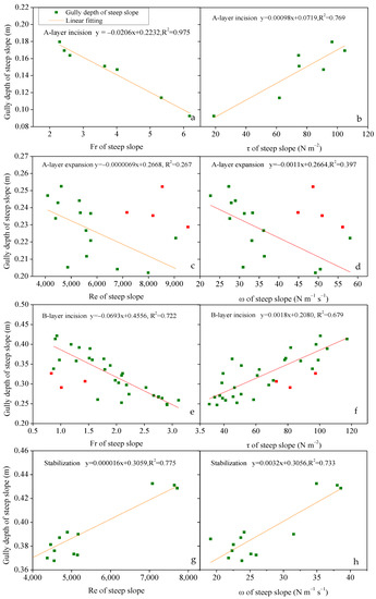 Figure 7 showed that the SD had a negative correlation with V, Fr, W, E, and e, and a positive correlation with Re, ƒ, τ, and ω except for the A-layer expansion stage. SW was positively correlated with ƒ and τ except for the A-layer expansion stage, and was negatively correlated with the other hydrodynamic parameters. The response sensitivity of SW and SD to hydrodynamic parameters was different between the four erosion stages. In general, SD, with larger correlation coefficients, was more sensitive to hydrodynamic parameters than SW. Moreover, SD had a fixed linear correlation with Fr (Figure 8a,e, p < 0.01, R2 > 0.72) and τ (Figure 8b,f, p < 0.01, R2 > 0.67) in the A-layer and B-layer incision stages, and ω (Figure 8d,h, p < 0.01, R2 > 0.39) and Re (Figure 8c,g, p < 0.05, R2 > 0.26) in the A-layer expansion and stabilization stages. By contrast, the hydrodynamic parameters, the closest related to SW, varied greatly in different erosion stages. Hence, the relationships between SD and hydrodynamic parameters were more reliable. Studying the hydrodynamic mechanism of gully depth development is more meaningful.