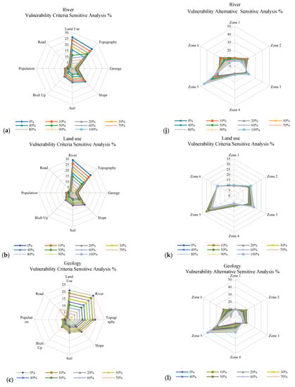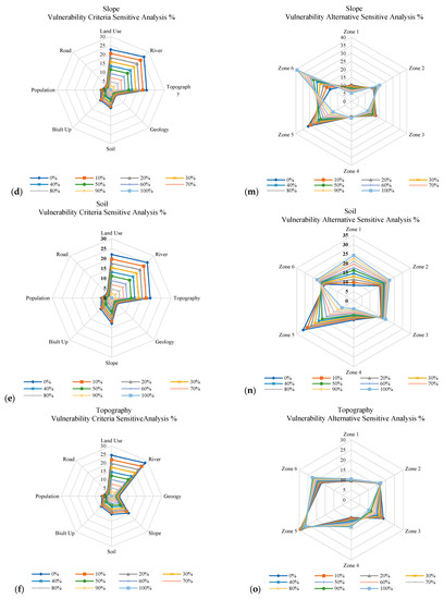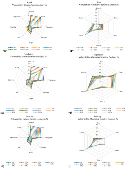 (a–i) Radar graph of the vulnerability criteria for coastal city erosion for Kuala Terengganu, Malaysia, as per sensitivity analysis conducted in Expert Choice software. (j–r) Radar sensitive graph between the vulnerability criteria and regions developed as an alternative.