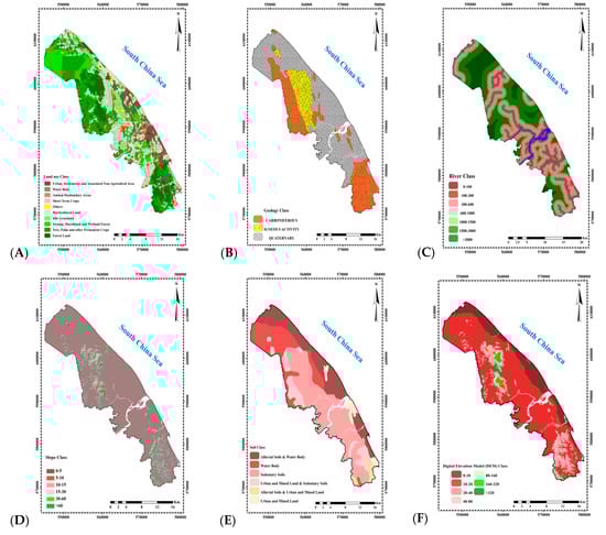 The CCVA for the semi-quantitative Delphi-AHP design refers to a locale characterised by a specific relative weakness of exposure to natural disasters and their ability to handle them when they occur. CCVA can provide an understanding of relative future changes in coastal cities. It can also be regarded as the theoretical basis for estimating the vulnerability of coastal cities relating to erosion caused by environmental and social factors. Based on the results of the Delphi-AHP model from experts’ opinion, the study constructed, classified, and quantified nine vulnerability GIS layers (VGL) into two domains, namely the environmental GIS layer (EGL) and the human activity GIS layer (HAGL) (Figure 4 and Figure 5).