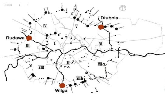 In terms of the desired spatial structure [25] (Map K1: Spatial structure—development directions and precepts) the areas under study were assigned in both the study and applicable local plans for non-landscaped greenery conservation and design. The presence of various forms of surface waters and landscaped greenery, including parks, green squares, river parks and buffer greenery was also permitted [25] (Volume III—Guidelines for Local Plans, p. 10). Furthermore, in the Rudawa River area, a land reserve (crossing a green area) was created for the construction of a road that would connect Krakow’s downtown area with the Balice airport.