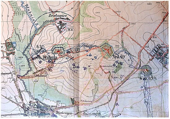 This study was based on documentation that includes the historical maps of Krakow’s fortification system (drawn to a scale of 1:10,000, sheets: no. 16 “Rakowice,” no. 20 “Olszanica,” no. 33 “Opatkowice”) [14], extension plans from the First World War (drawn to a scale of 1:10,000), and unpublished archival photographs from 1915.