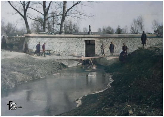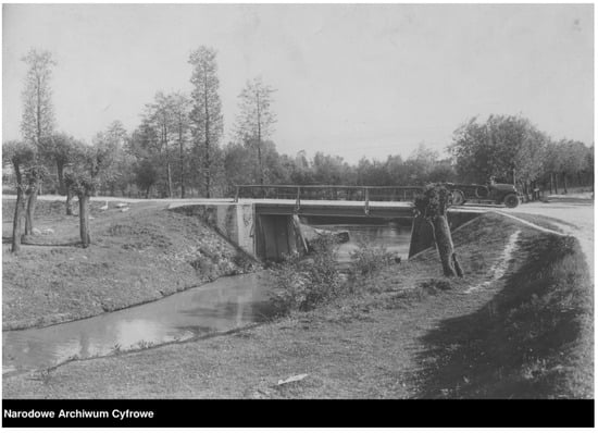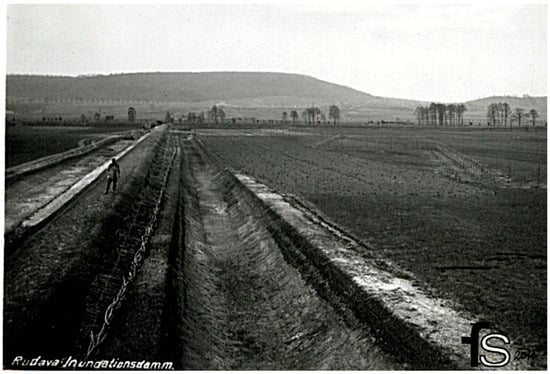 Water impoundment in the Rudawa river valley was performed between two waterways, namely between the Rudawa and its millrace, the Młynówka. It was located around 0.5 km to the south of Fort 41a Mydlniki. The impoundment was possible by building an earthen levee across the valley along with the channel connecting both waterways (originally named Rudawa Inundationsdamm). The inundation channel along with an embankment between the Rudawa and Rudawa’s millrace were built in an agricultural area. An archival photograph shows a fragment of the structure with the completed earthworks and the reinforcement of the levee bank using a layer of stone. The bed of the channel had a circular cross-section, typical for structures from the beginning of the twentieth century. The photograph also shows the reinforcement of the bank zone with a system of fascines, further strengthened by fences from wooden posts and wicker. From the side where attacks were to take place, a strip of obstacles from wire on barrier rods was built (Figure 5).