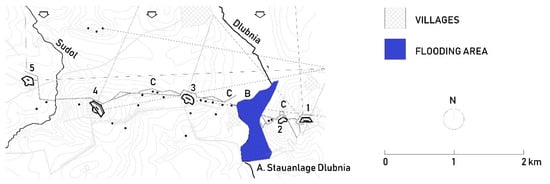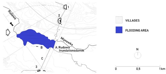 The material collected allowed for an in-depth analysis of the size of potential inundation areas. The literature (Biesiekierski, 1922) [18] points to the application of needle dams [24] with a maximum restriction level set at around 1.8 m. By analogy, this level was also assumed for the structures under analysis.