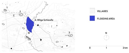 The Wilga’s waters were dammed using a particular complex of buildings and devices. Its course could be closed using the fortress’s valve weir and a second levee across the river valley (originally named Wilga Schleuße, Staudamm a.d. Wilga). They formed an extensive hydraulic structure dedicated strictly to military needs (Figure 4). Relatively near the weir, at around 0.5 km to the west, is the surviving Fort 52a Jugowice-Łapianka.
