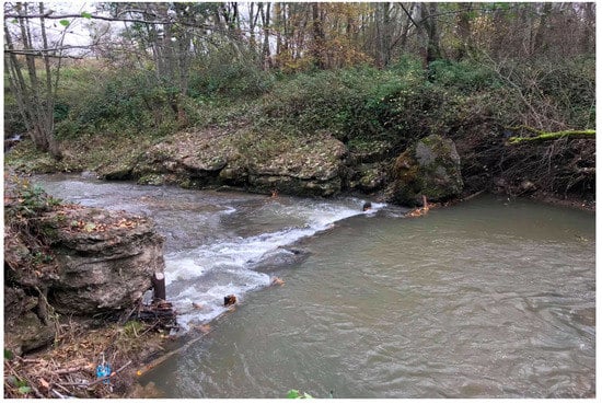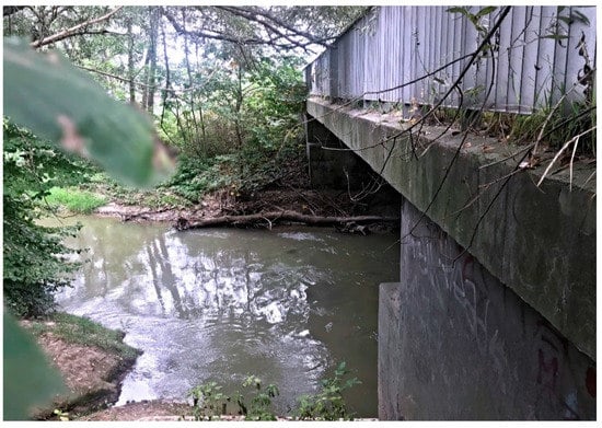 In the Wilga riverbed, one can find the remains of its weir, in the form of a broken-up concrete slab and the fragment of the northern abutment of an earthen levee. The structural elements of the levee are visible, namely, the spaces between the stone walls filled with non-reinforced concrete and large-fraction lime aggregate. The area of the levee and weir complex is currently located in direct proximity to Krakow’s expressway bypass. A part of the complex abuts the roadway, while another is an overgrown area covered with wild plants (Figure 10).