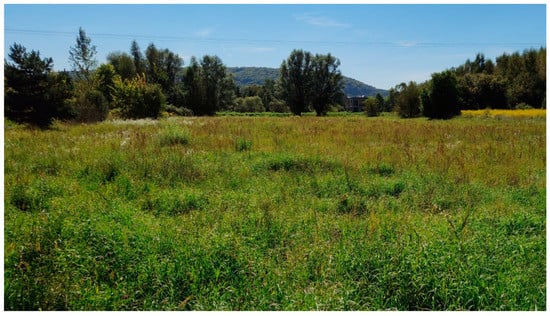 In the Rudawa valley, urbanization processes and development expansion did not transform the area under study to a significant degree. Yet, agriculture and melioration work erased the course of the channel and the levee. Only a meadow is now present, slowly being overgrown with high greenery (Figure 11). The area is used to a minimal degree, mostly for farming and partially for strolling through non-landscaped greenery. The only site fully developed for recreation is a footpath that abuts the millrace bed. The technical infrastructure in the area is also not without significance: it consists of two underground Ø1200 water supply collector pipes and a high-voltage overhead power line.