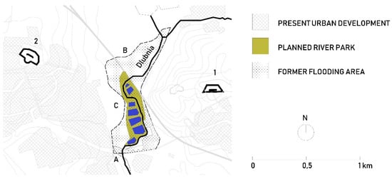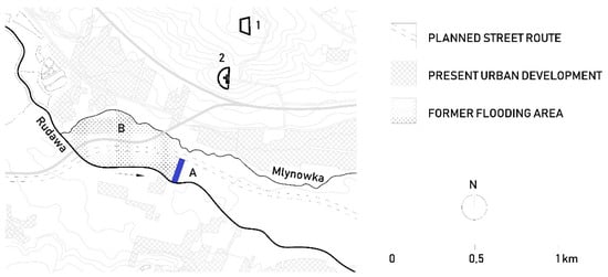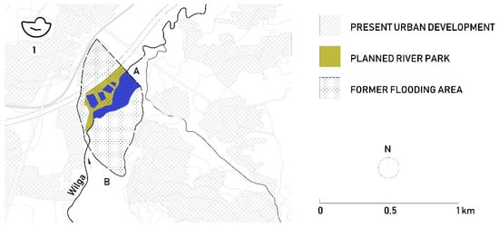 The former inundation area of the Rudawa is currently difficult to recreate. The primary hindrance here is underground municipal infrastructure that perpendicularly crosses the area, thereby limiting potential interventions. The land reserve stipulated in the area’s local spatial development plan, intended for road construction, is an obstacle here. Another difficulty is the inability to precisely identify the channel’s location. There are no clear traces of its presence in the area, and the applicable land development plan does not feature an obligation to reconstruct it. Despite this, the need for non-landscaped greenery which predominates in planning guidelines, can be used as a pretext for the location of a new hydrotechnical structure, and the channel identified in this study appears to be the most attractive element for reconstruction. Placed as it had been originally, perpendicular to the bed of the Rudawa, it would act as a retention reservoir that would allow water infiltration into the soil, with the possibility of draining its excess into the river [48]. The estimated area of the channel, delimited by the reserve of the planned road, is proposed to be around 0.3 ha. The channel would be primarily an earthen structure, linked with nearby transport and circulation routes, especially pedestrian ones. It would also be an excellent example for implementing similar solutions used for periodical retention in contemporary development. Analogously to other sites, it would require proper infrastructure and annotation, providing historical knowledge (Figure 14).