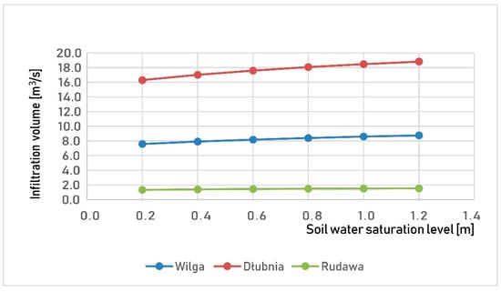 The analysis covered the infiltration potential of the proposed solutions, as defined in three working models, while noting that the infiltration would be performed by the proposed reservoirs. The effectiveness of the total operation of the reservoirs in the waterfront parks of the Dłubnia and the Wilga was calculated, assuming maximum use. Analogous calculations were performed for the Rudawa channel. The total area of the reservoirs was set at a level of 40% of the area of the accompanying waterfront park. Each reservoir (pond) would receive surface runoff, retain it, and allow it to be absorbed into the soil. Any excess runoff would be redirected to the adjacent river [49,50]. Filtration speed was assumed to have the conditions of a unidimensional set flow through the soil, either partially or fully saturated with water, as found in Darcy [47]. It was also assumed that soil humidity increases along with depth, until the groundwater table is reached [51]. The initial groundwater level was assumed in concordance with the real-world conditions present in the areas under study [52]. The infiltration volumes for the proposed reservoir sizes, listed in m3∙s−1, are presented in Figure 15.
