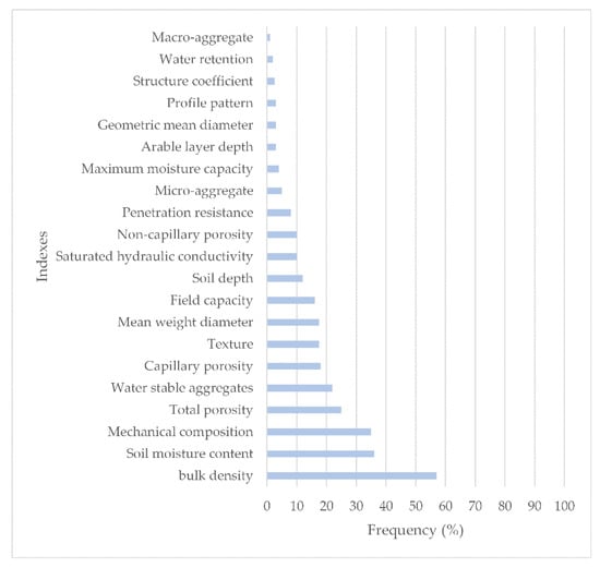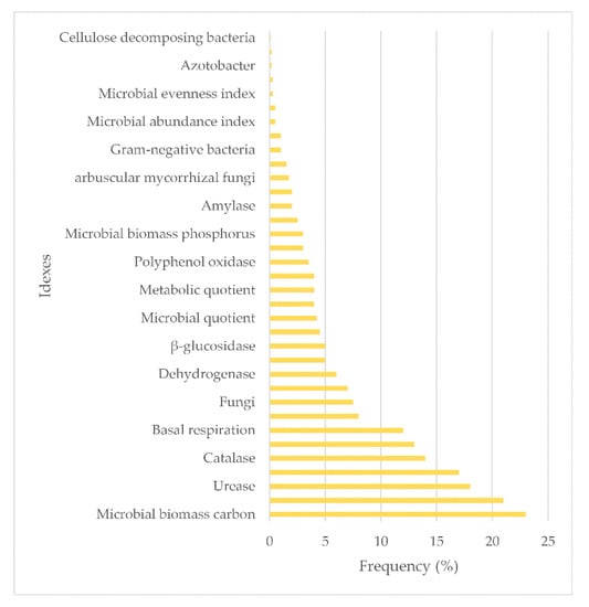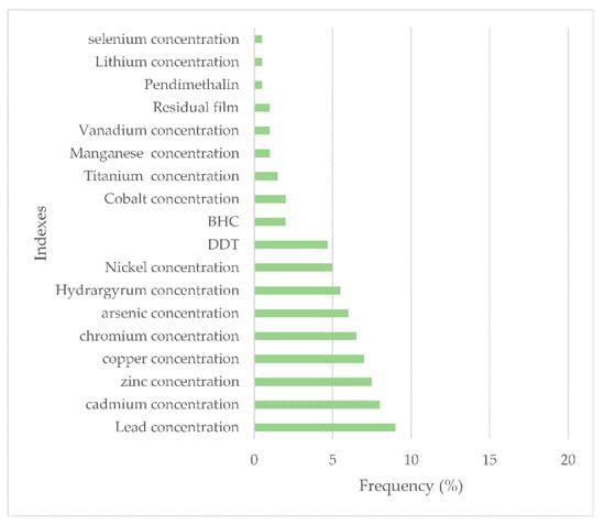 Step 3: The retrieved literature was counted, and the evaluation indices used in the selected literature were divided into four categories: physics [,], chemistry [,], biological [,] and environment [,]. Finally, the frequency of index selection was analysed. Through the indices and data obtained, Excel (Microsoft, Washington, DC, USA) was used to sort, filter, statistics and graph. The results are shown in Figure 1, Figure 2, Figure 3 and Figure 4.