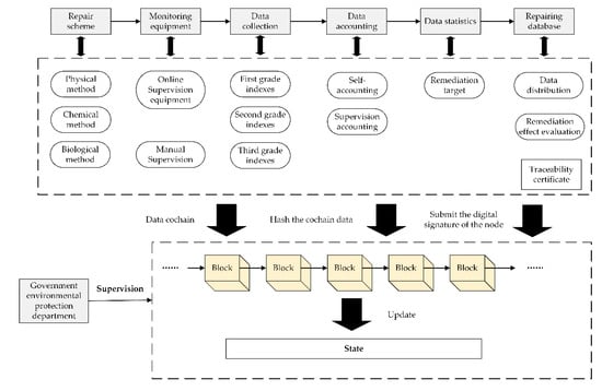 As shown in Figure 5, the data problems in the soil remediation effect evaluation index system mainly stem from loopholes in the supervision process. It can be optimized and solved through the collaborative, digitization, intelligence, decentralization, information transparency, anti-tampering, traceability and other functions of the blockchain network. At the level of management mechanisms involving supervision and accountability, traditional problems such as data that are difficult to trace and the subject of the problem are difficult to trace, and identity authentication and digital signatures in the core technology of the blockchain will provide a traceable evidence chain []. At the same time, the unique chain storage structure and consensus mechanism greatly increase the difficulty of illegally tampering and repairing data. Through identity authorization and access authentication, the data on the blockchain have the transparency characteristics of the entire network and all nodes []. Both the pollution data and the repair data need to be approved by the consensus node and then uploaded to the chain. Then, the data on the chain can be quickly queried to the block height through the Merkel tree. Asymmetric encryption technology provides completeness and security guarantees for data sharing [] to realize reliable information transmission and sharing among multiple subjects.