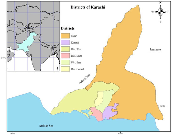 Located on the coast of the Arabian Sea, the city of Karachi lies in the extreme south of Pakistan. It has a total area of approximately 3530 square kilometers. As per the latest census of 2017, the population of Karachi is approximately 16 million, making it one of the largest metropolitan cities in the world [33]. Due to the migration of the people from rural to urban areas in search of better livelihoods, the population of Karachi is increasing rapidly. This additional increase in population has put pressure on all the available resources and utilities of the city, including water. As a result, groundwater extraction has also increased [33]. In 2001, the number of households in Karachi was about 2.1 million, which increased to 3.9 million in 2020. Of the 3.9 million households, almost 75 percent lie in the category of low-income and poor groups, while the remaining 25 percent constitute middle- and high-income groups.