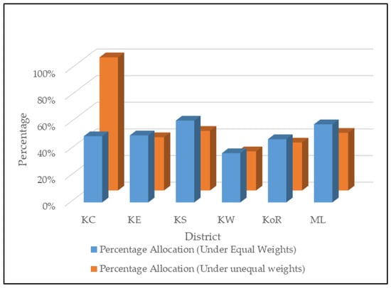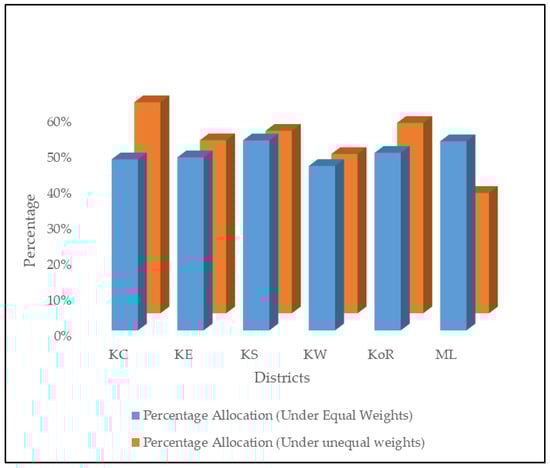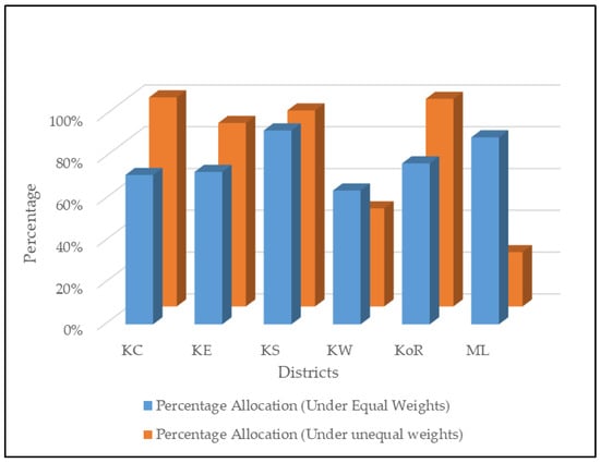 Table 6 shows the allocation of water among the six districts of Karachi by applying the Nash bargaining theory under three different scenarios, using homogenous and heterogenous weights. In the first scenario, the total water availability is 650 MDG, whereas the water requirements for all the districts amounts to 866 MDG. The water shortage, therefore, is 226 MDG. The bargaining weights of the districts are taken according to their population density. It is assumed that higher population density of any district will lead to more complex water supply networks, and hence more leakages. Therefore, those districts having greater population density are given preference in terms of water allocation. Figure 2 shows the results of scenario 1 under homogenous and heterogenous weights. Similar results for scenarios 3 and 4 are depicted in Figure 3 and Figure 4, respectively.