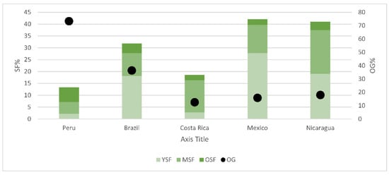 Secondary forest stages (stacked column) and old-growth forest (dot) as a percentage in 2008. YSF, young secondary forest (≤20 years); MSF, mid (20–60 years); OSF, old (60–100 years); OG, old-growth (>100 years) forest. Original data are from [] based on a chronosequence in a network of ground plots across Latin America and the Caribbean forests.