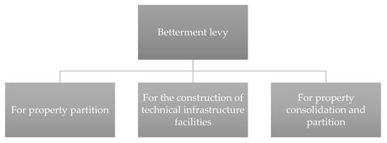 The legislature provided for three cases in which a local government unit may charge the betterment levy: as a result of property partition [20], for consolidation and partition, and for the construction of technical infrastructure (Figure 1).