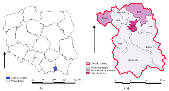 The survey was conducted in Gorlicki County for several reasons. There is a lack of analyses of betterment levy charging in this area and, consequently, a lack of specialised papers devoted to this issue. Furthermore, this area was selected for its unique land possession structure and considerable plot fragmentation, which is a consequence of the inheritance system in this area, dating back to the times of the Austrian Partition. Gorlicki County is located in the northeastern corner of Małopolskie Voivodeship, in the Low Beskid mountain range (Figure 2a). Gorlicki County covers an area of 966.7 km2 and comprises 10 administrative units (Figure 2b): the city of Gorlice; the two rural–urban communes of Biecz and Bobowa; and the seven rural communes of Gorlice, Lipinki, Łużna, Moszczenica, Ropa, Sękowa, and Uście Gorlickie.