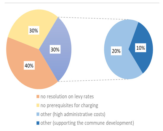 Three respondents indicated the lack of analyses (estimation) of the increase in the property value following the execution of specific investment activities using public funds as the reason for the discontinuation of charging of the betterment levy (Figure 3). Another reason for the discontinuation of charging indicated by the respondents in two cases was the high administrative costs associated with the charging of this levy. Moreover, an employee of a commune responded that through the discontinuation of betterment-levy charging, the commune’s authorities wanted to support socio-economic development.