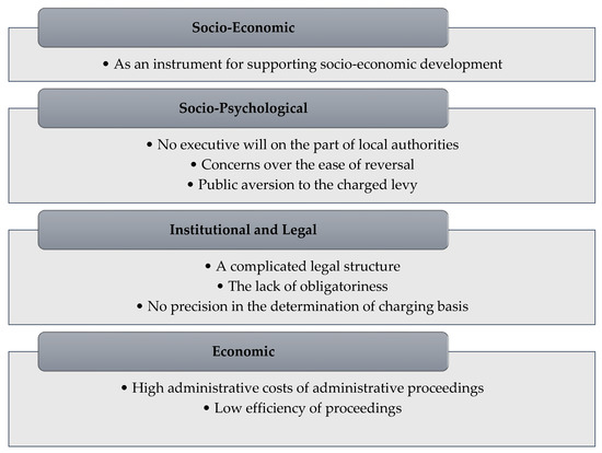 The reasons for the discontinuation of betterment-levy charging can be divided into four main thematic groups: (1) socio-economic; (2) socio-psychological; (3) institutional and legal; and (4) economic (Figure 5). In the first category (socio-economic reasons), one specific reason for the discontinuation of the levy charging that emerged in the respondents’ answers and was reflected in other studies [29] can be qualified—the discontinuation of betterment-levy charging may be an instrument supporting socio-economic development, and may prevent the marginalisation of the area in which the levy charging was discontinued.