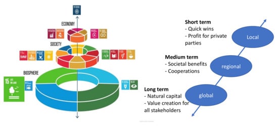 Therefore, we, as editors of the Special Issue, would like to highlight differences that the viewpoint (economy, society, or biosphere) create when designing management options. The viewpoint of ‘economy’ (Figure 1, top) strives for economic growth and therefore often aims for fast return of investment, resulting in quick wins. Since long stakeholder processes consume time and money, these benefits are often only for the directly involved individuals or companies (private parties). In general, the scale involved is the small local scale, e.g., a farmer’s field used to its maximum capacity, or deforestation for generation of new agricultural fields, without taking into account the long-term or environmental effects.
