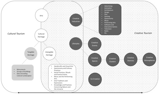 Building upon the concept of cultural tourism and the existing framework of cultural attractions, this article contributes to a better distinction (both textually and visually, through diagrams) between cultural and creative tourism, by examining the key elements of these types of tourism. Here, we have introduced a new typology of creative tourism activities (or key elements at the core of most creative tourism experiences) encompassing the following six categories: (1) arts, (2) creative industries, (3) creative spaces, (4) creative events, (5) intangible heritage, and (6) co-creation activities. In essence, creative tourism expands the range of attractions that configure cultural tourism, bringing in new intangible contents (more oriented towards the present and the future), along with technological innovations, and a focus on contemporary creativity, whereby tourists become increasingly involved in co-creation processes.