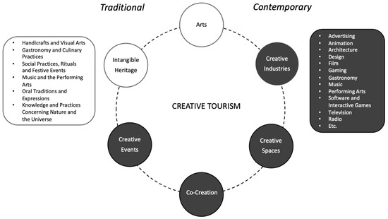 In our approach, creative tourism rather becomes an overarching concept, which includes six major groups, or categories, of experiences: (1) arts—fine and applied arts (e.g., photography workshops); (2) creative industries (advertising, animation, architecture, design, fashion, film, gaming, gastronomy, music, performing arts, software and interactive media, television, radio, books, and press, etc.); (3) creative spaces—creative enclaves, creative districts, creative clusters (e.g., in China, clusters such as the 798 Art Zone, in Beijing, mentioned in [6] (p. 2)); (4) creative events—spectacles, shows, performances, ethnic events, festivals, fairs, feasts, museum nights, etc.; (5) intangible heritage (handicrafts and visual arts; gastronomy and culinary practices; social practices, rituals, and festive events; music and the performing arts; oral traditions and expressions; knowledge and practices concerning nature and the universe); and (6) co-creation activities—connective/relational dimension between visitors and locals, with an emphasis on co-production (e.g., hands-on activities, creative workshops, or more technologically-based interactions—through websites, mobile apps, immersive devices, virtual environments) e.g., [22] (p. 19), [34,35]. However, it should be noted that these main categories are not necessarily mutually exclusive. In practice, many creative tourism experiences offered at tourism destinations often combine some of these dimensions/core elements.