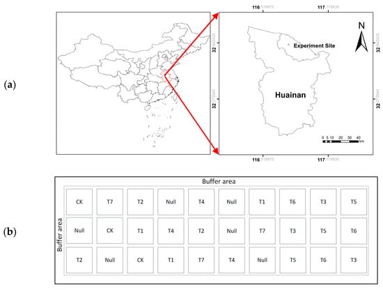 The experimental site was built on 17 January 2018, in the coal gangue reclamation area of Dongchen ecological park, Huainan, Anhui Province (32°79′ N, 116°73′ E) (Figure 1a). Huainan is located in the north-central part of Anhui Province, in the Huainan mining area, an important coal production base of China.